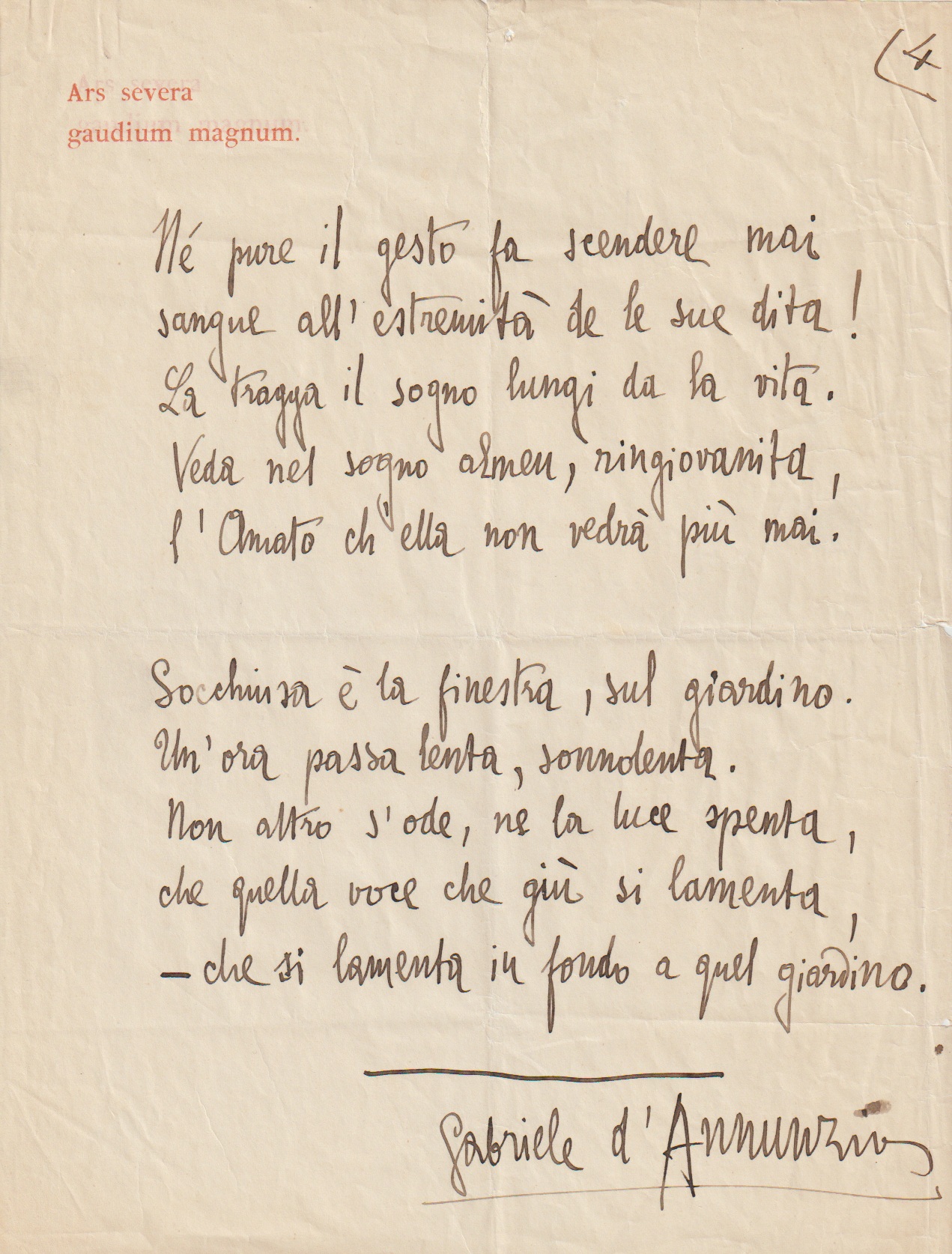 Les manuscrits poétiques de d’Annunzio sont particulièrement rares.