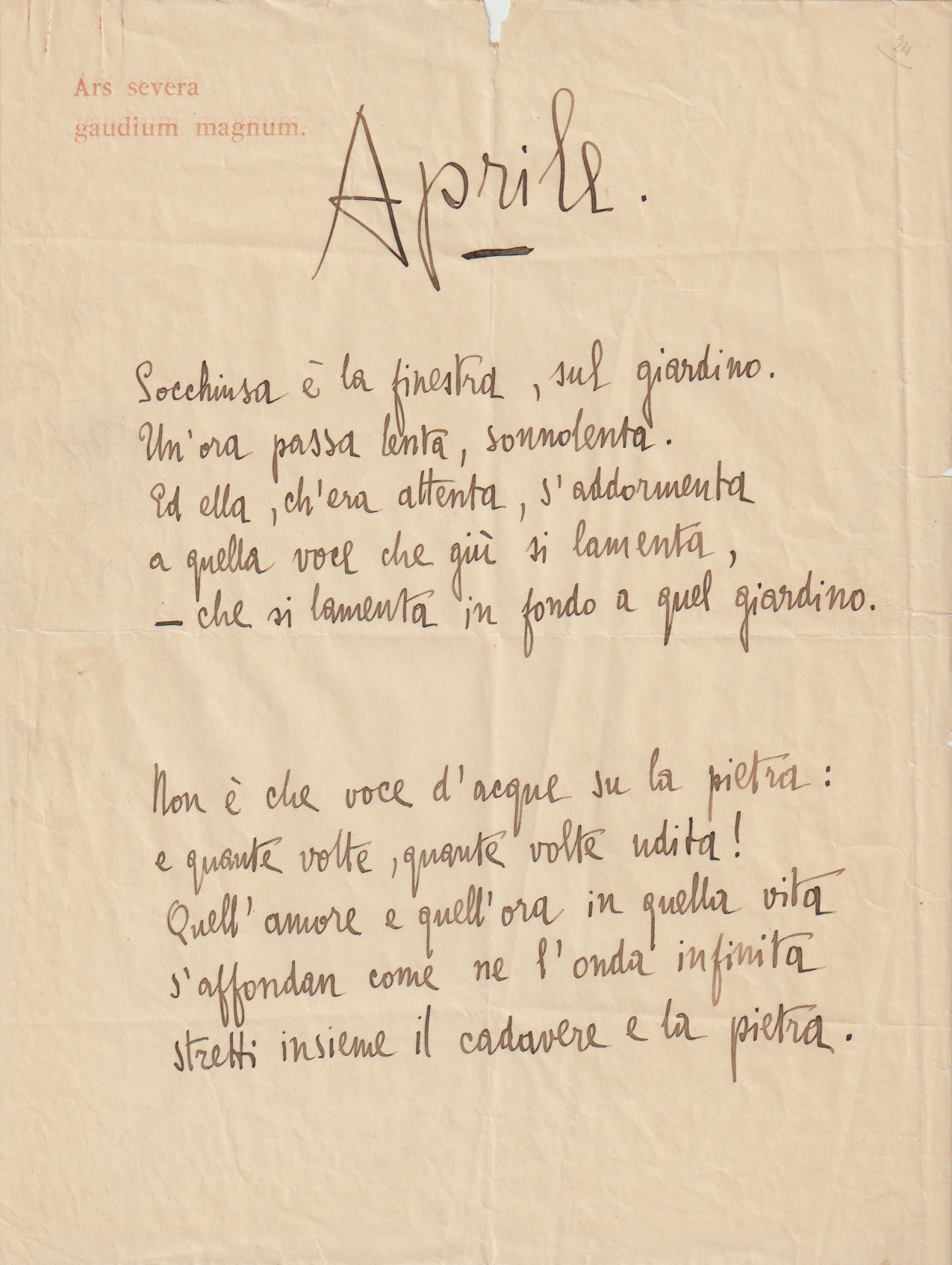 Rare manuscrit poétique de Gabriele d’Annunzio, qui recopie ici son poème Aprile, extrait du recueil « Poema Paradisiaco » publié en 1893.