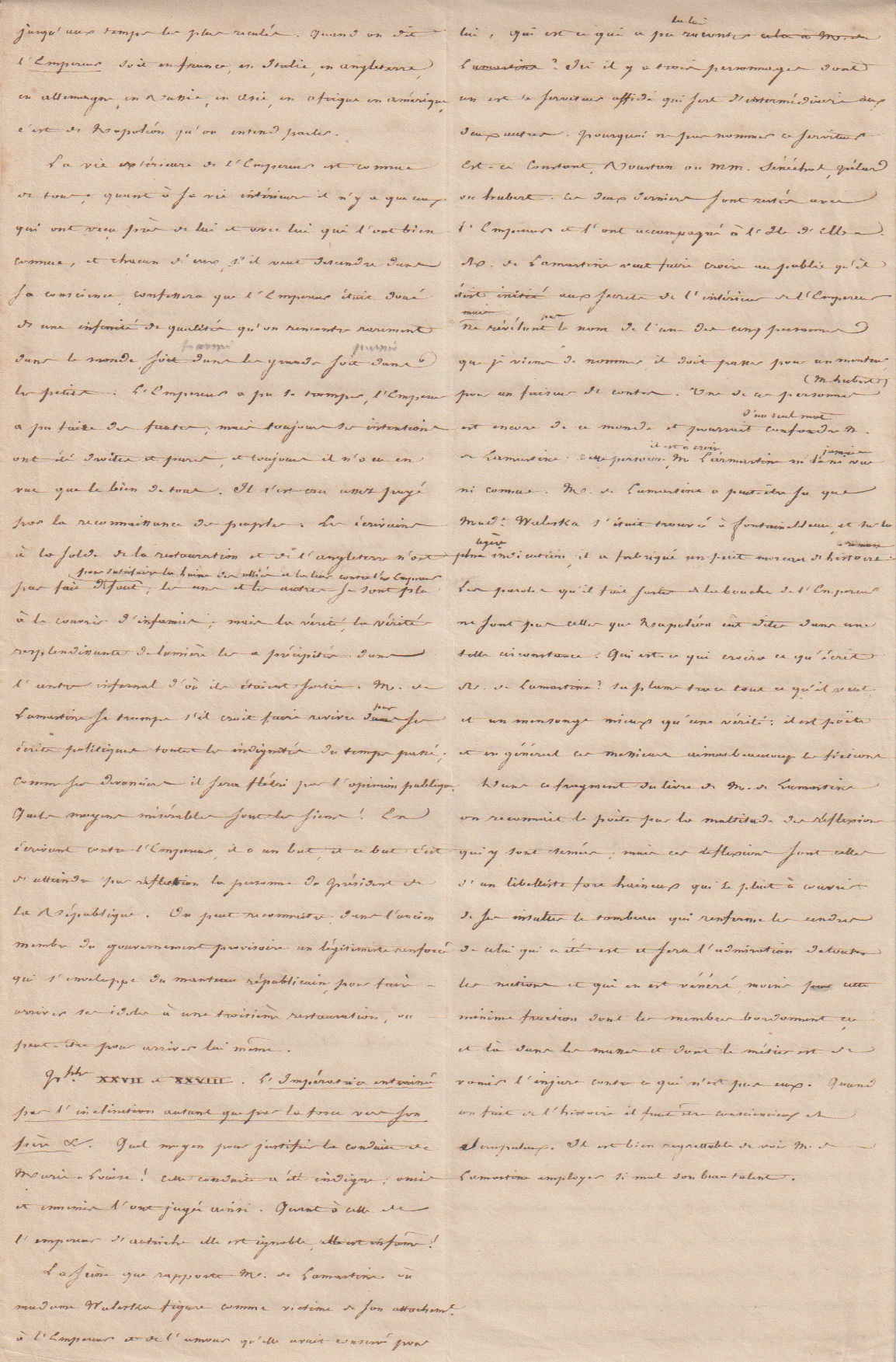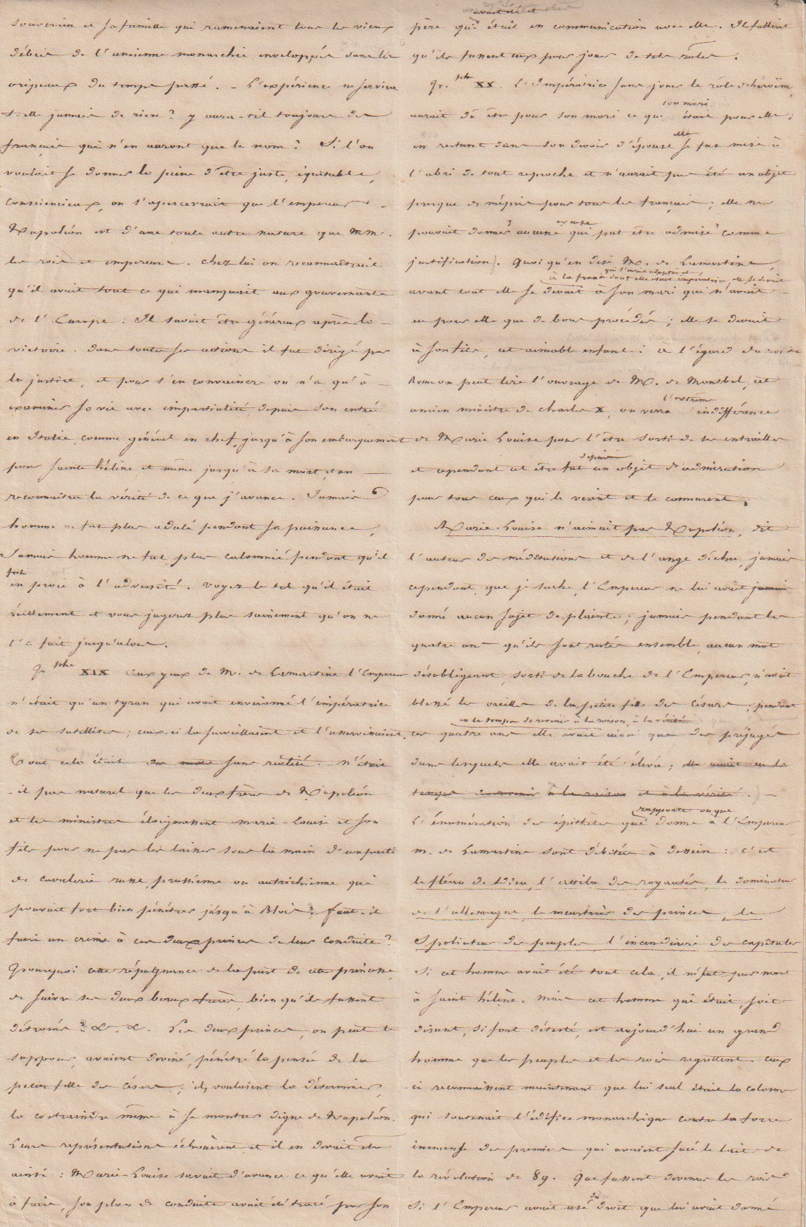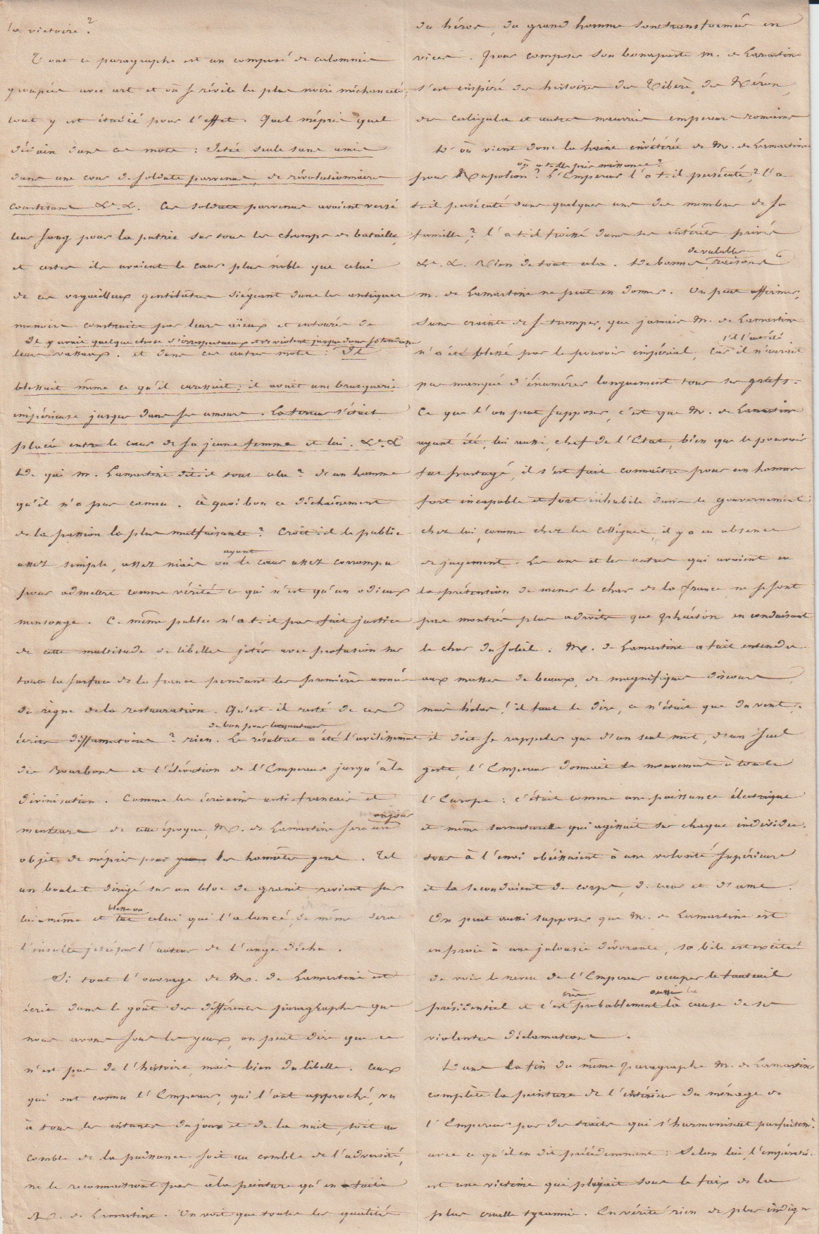 Dans le manuscrit que nous présentons, le Mamelouk Ali attaque Lamartine, qu’il accuse d’avoir publié dans son Histoire de la Restauration nombre d’erreurs voire de mensonges concernant Napoleon.