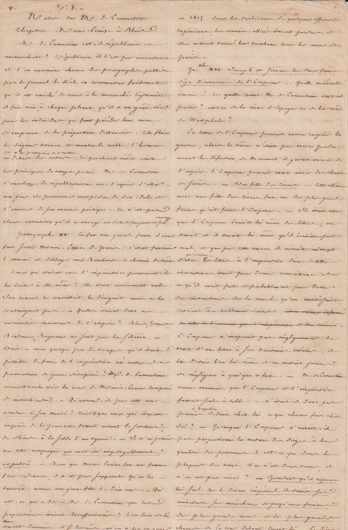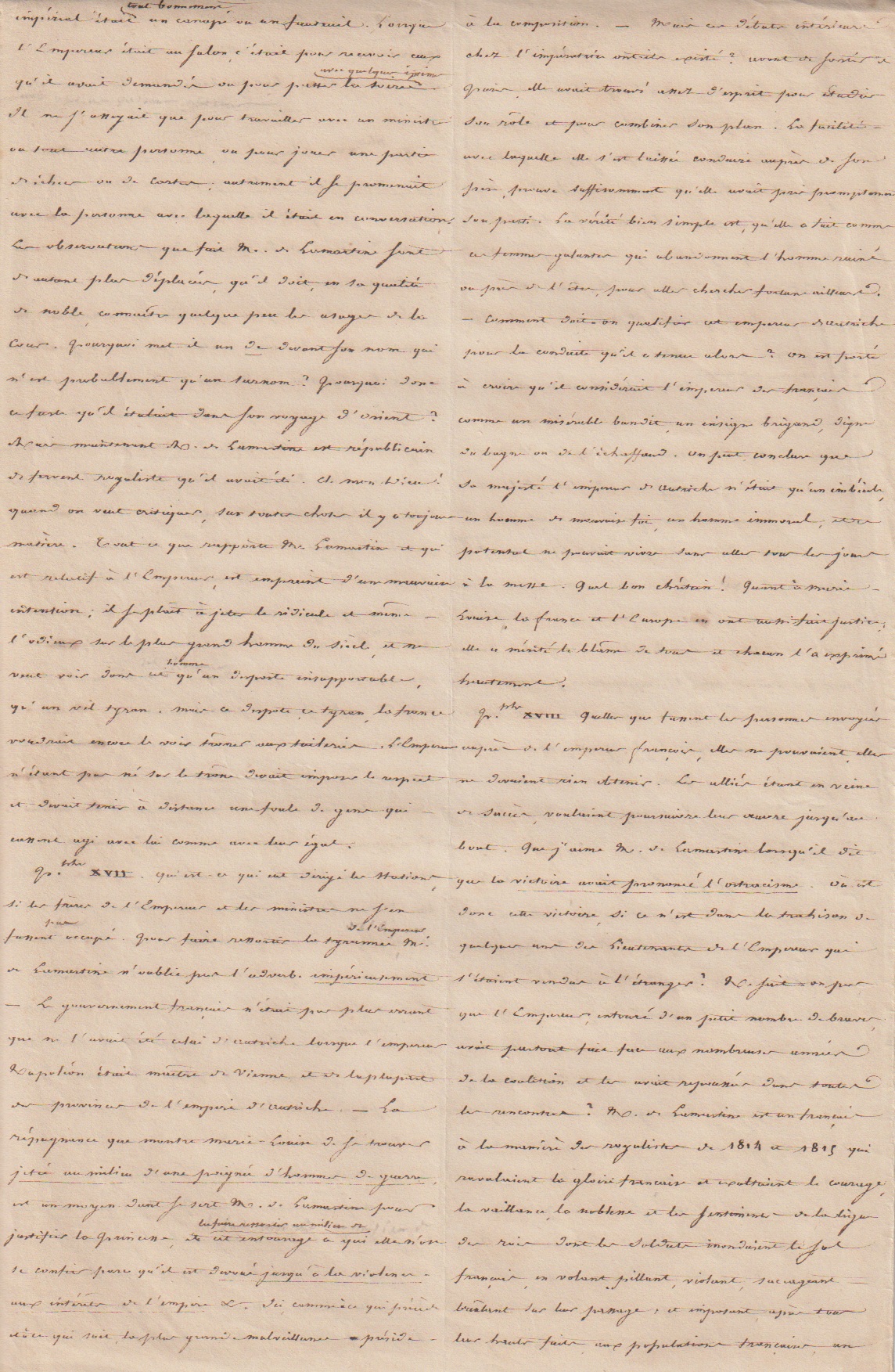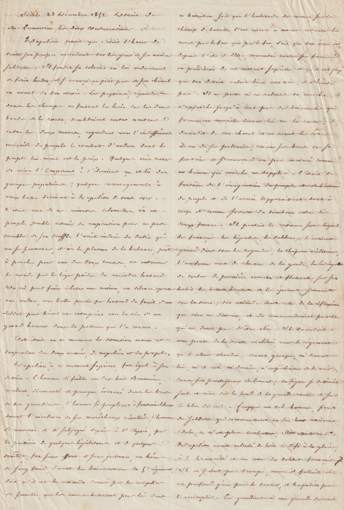 Dans le manuscrit que nous présentons, le Mamelouk Ali attaque Lamartine, qu’il accuse d’avoir publié dans son Histoire de la Restauration nombre d’erreurs voire de mensonges concernant Napoleon.