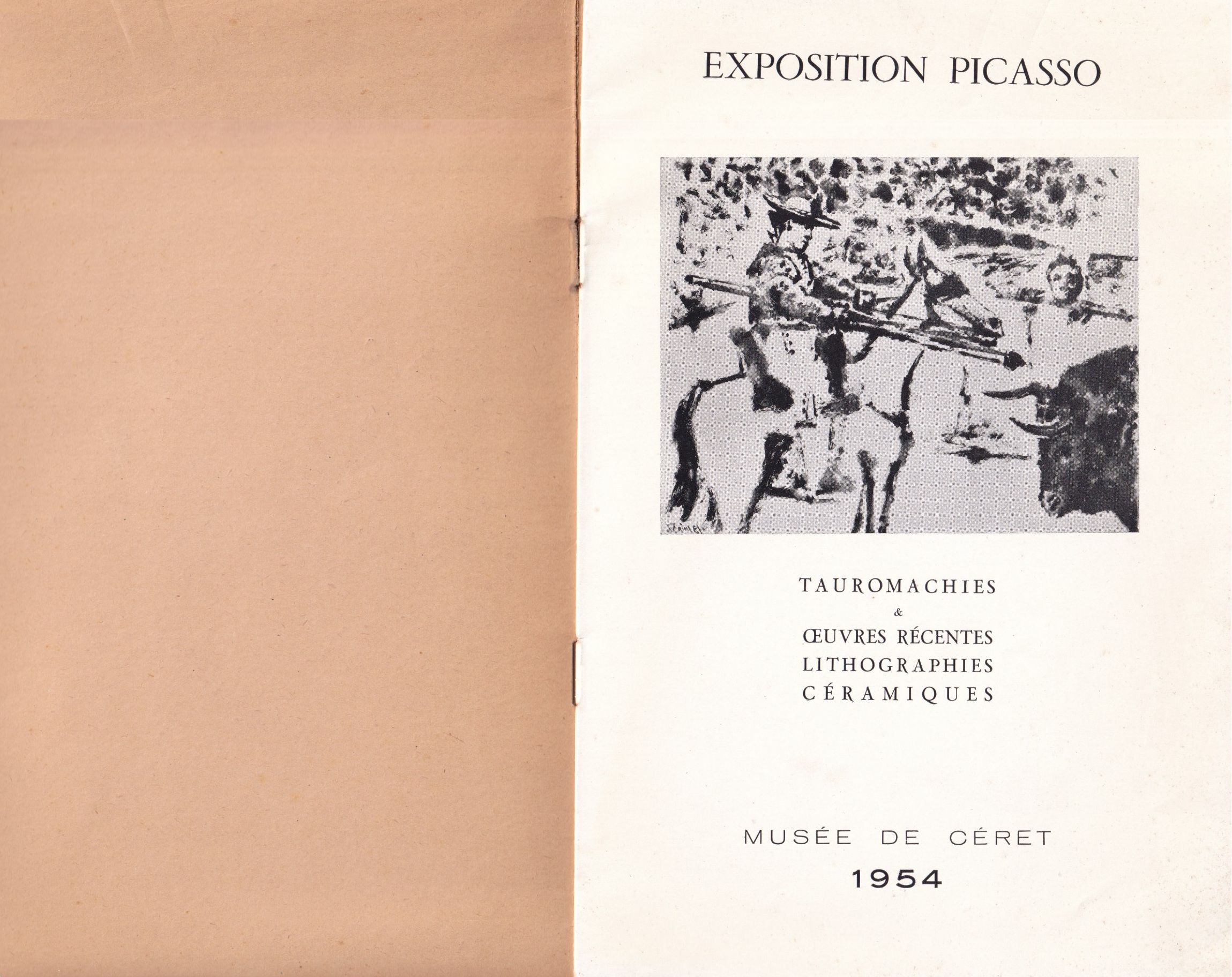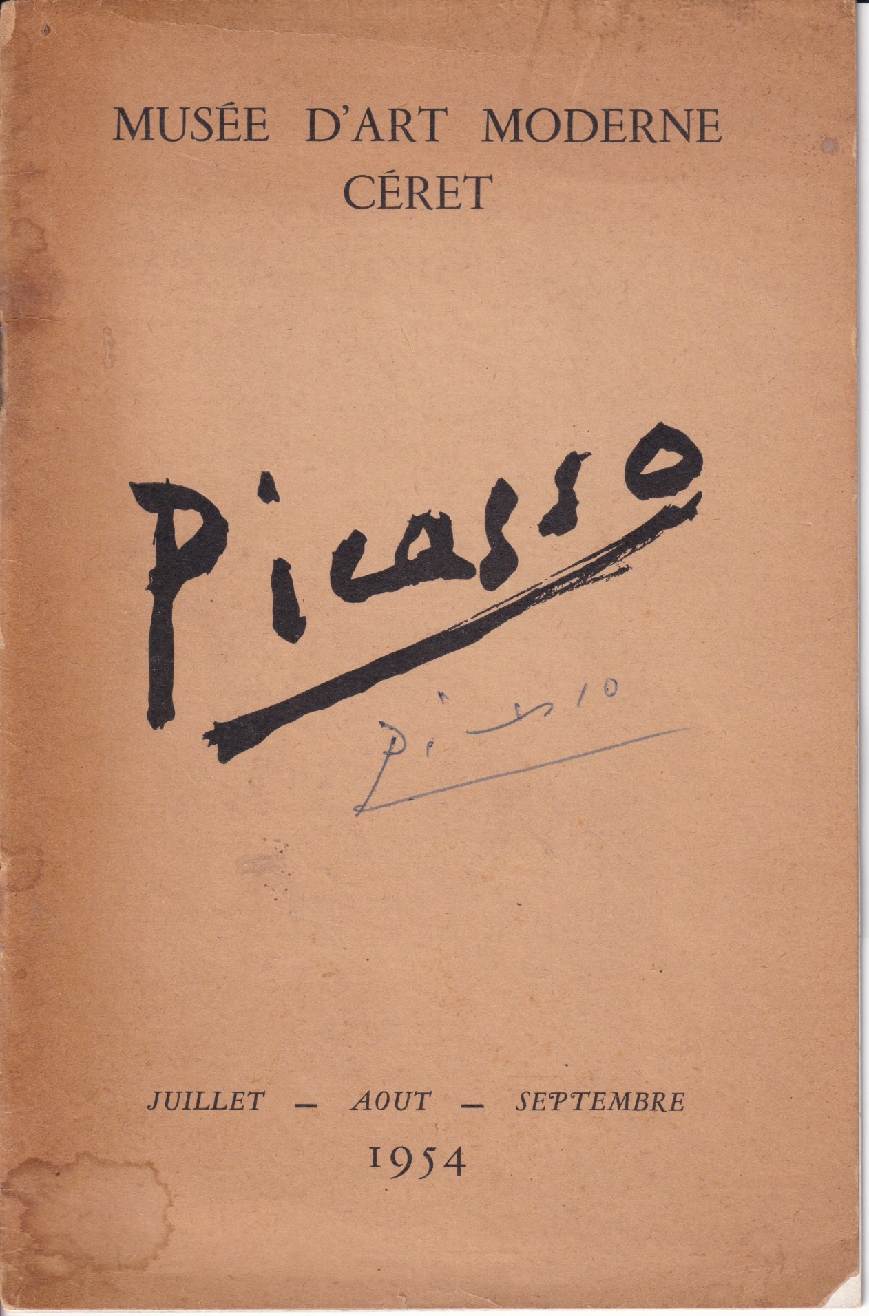 Livret de l’exposition Picasso au Musée d’Art Moderne de Céret de juillet à septembre 1954, signé par Picasso au stylo bille bleu sur la couverture.